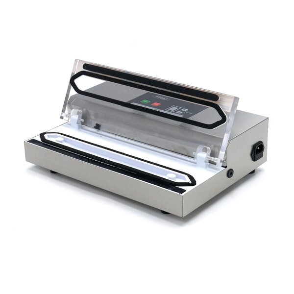 Deze luxe vacuum sealer is ideaal voor het luchtdicht verpakken van vlees, vis, groenten, fruit en vloeistoffen zoals sauzen en soepen. Het apparaat werkt volledig automatisch en is voorzien van een digitaal bedieningspaneel waarmee vacumeertijd, vacumeerdruk, sealtijd en sealtemperatuur apart instelbaar zijn. De vacuum sealer heeft een transparante deksel en een behuizing van roestvrij staal. Dankzij de dubbele pomp en de pulseerfunctie kunnen ook zachte producten zorgvuldig worden verpakt. Het compacte tafelmodel staat stevig op vier rubberen pootjes en is eenvoudig schoon te maken met een vochtige doek. dat deze machine alleen geschikt is voor vacumeerzakken met reliëf. Met een korte sealtijd van enkele seconden worden producten snel en strak verpakt tot een vacuüm van 0,96 bar.