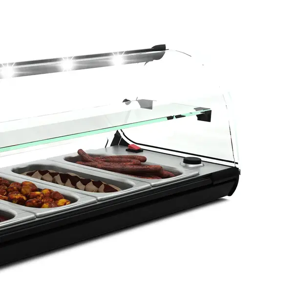 De displayruimte is afgewerkt met hoge kwaliteit gehard glas met minimale omlijsting voor optimale zichtbaarheid van alle kanten. Daarnaast is de bodem van deze verwarmde tapasvitrine speciaal ingericht voor 1/3 GN-bakken en wordt het apparaat geleverd inclusief een complete set perfect passende RVS GN-bakken.