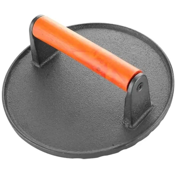 Braadgewicht (Ø180 x 60 mm) van gietijzer met houten handvat voor het sneller bakken van vlees en bacon zonder dat het gaat krullen. Niet vaatwasserbestendig.