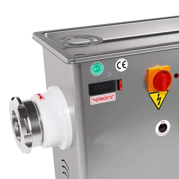 Het apparaat heeft een vaste gekoelde kop - voor optimale performance en vleeskwaliteit bij intensief gebruik - en grote verwerkingscapaciteit tot 450 kg per uur. Bediening is heel eenvoudig met de aan-/uitschakelaar en de koeling is thermostatisch instelbaar met LED-display.