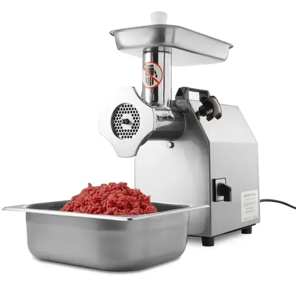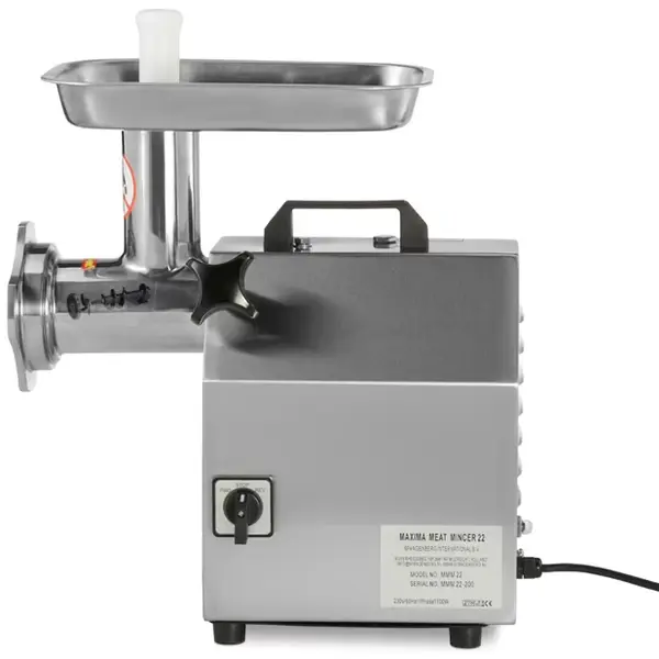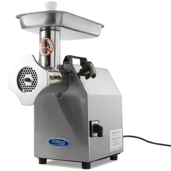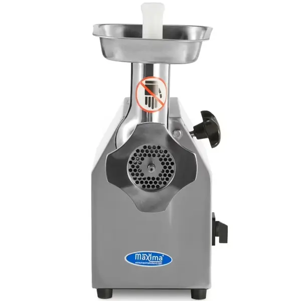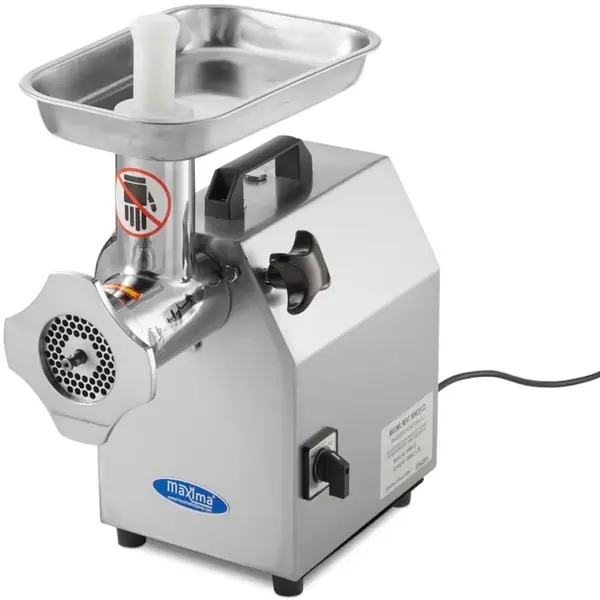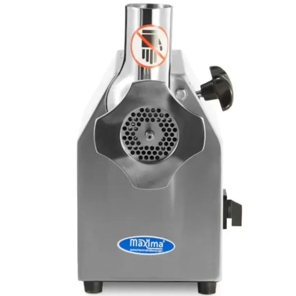 Deze Maxima vlees-/gehaktmolen is een robuuste, professionele tafelmodel vleesmolen die ideaal is voor restaurants en slagerijen. Met een vermogen van 1,1 kW verwerkt hij moeiteloos tot 220 kg vlees per uur, waardoor hij geschikt is voor continu gebruik. De volledig RVS behuizing en schaal zorgen voor duurzaamheid en hygiëne. Dankzij de verwijderbare maalkop is het apparaat praktisch in gebruik en snel klaar voor reiniging. De molen wordt standaard geleverd met twee roosters (6 en 8 mm), kruismessen, een stopper en een worstenvuller, wat hem veelzijdig inzetbaar maakt voor gehakt, worsten en meer.