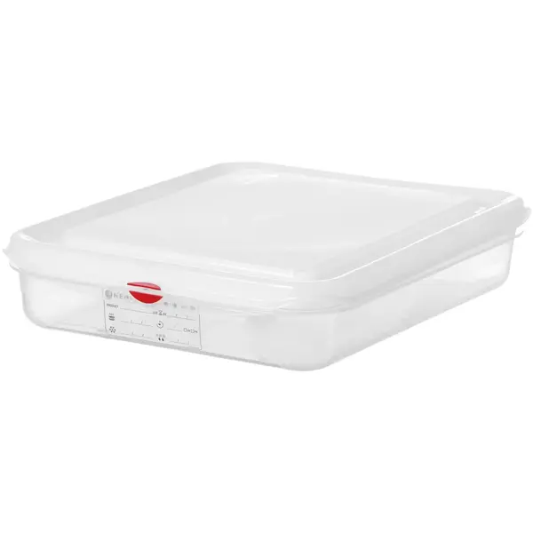 De voedseldoos is voorzien van kleurclips (groen, geel, blauw en rood volgens de HACCP-richtlijnen) en een geïntegreerd HACCP-label, te gebruiken met uitwisbare markers (apart verkrijgbaar) voor eenvoudige controle van de inhoud. De doos is geurbestendig, luchtdicht en geschikt voor invriezen, koelen en warme opslag, met een temperatuurbestendigheid van -40ºC tot +100ºC.