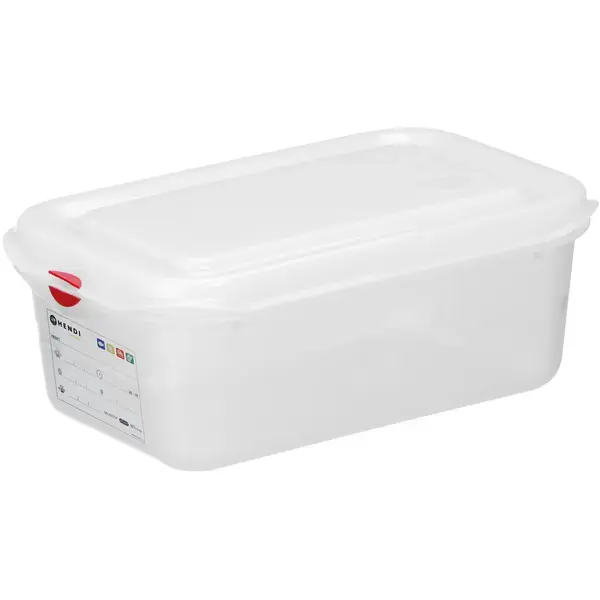 Deze kunststof voedseldoos van HENDI heeft een formaat van 1/4 GN en is gemaakt van hoogwaardig polypropyleen. De doos is duurzaam, stapelbaar en voorzien van een veilig, lekbestendig deksel.