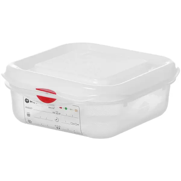 De voedseldoos is voorzien van kleurclips (groen, geel, blauw en rood volgens de HACCP-richtlijnen) en een geïntegreerd HACCP-label, te gebruiken met uitwisbare markers (apart verkrijgbaar) voor eenvoudige controle van de inhoud. De doos is geurbestendig, luchtdicht en geschikt voor invriezen, koelen en warme opslag, met een temperatuurbestendigheid van -40ºC tot +100ºC.