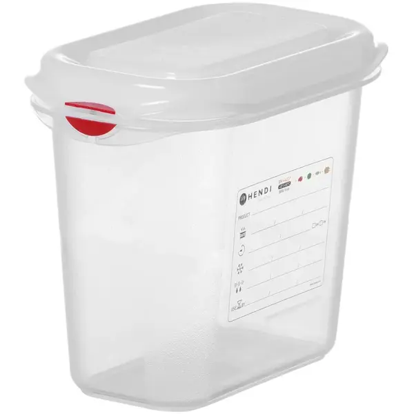Deze kunststof voedseldoos van HENDI heeft een formaat van 1/9 GN en is gemaakt van hoogwaardig polypropyleen. De doos is duurzaam, stapelbaar en voorzien van een veilig, lekbestendig deksel.