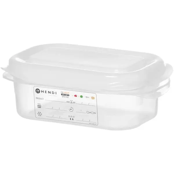 Deze kunststof voedseldoos van HENDI heeft een formaat van 1/9 GN en is gemaakt van hoogwaardig polypropyleen. De doos is duurzaam, stapelbaar en voorzien van een veilig, lekbestendig deksel.