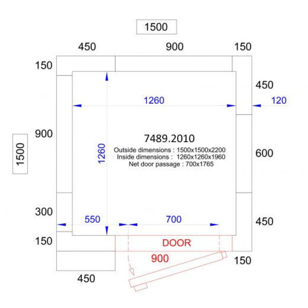 Binnenafmetingen: B 1260 x D 1260 x H 1960 mm