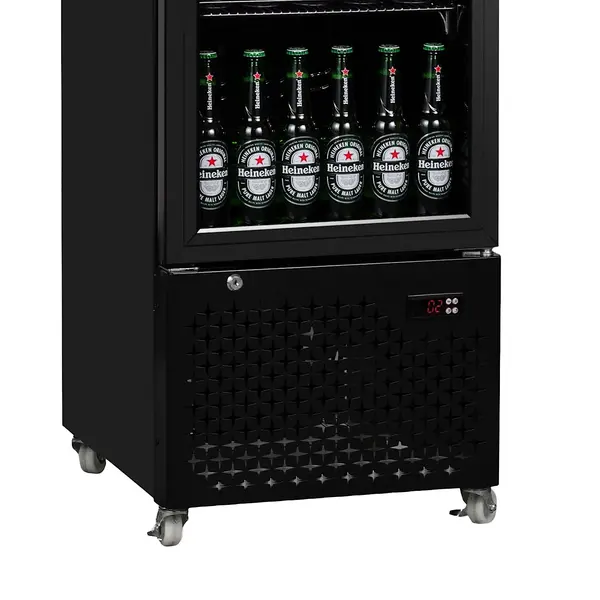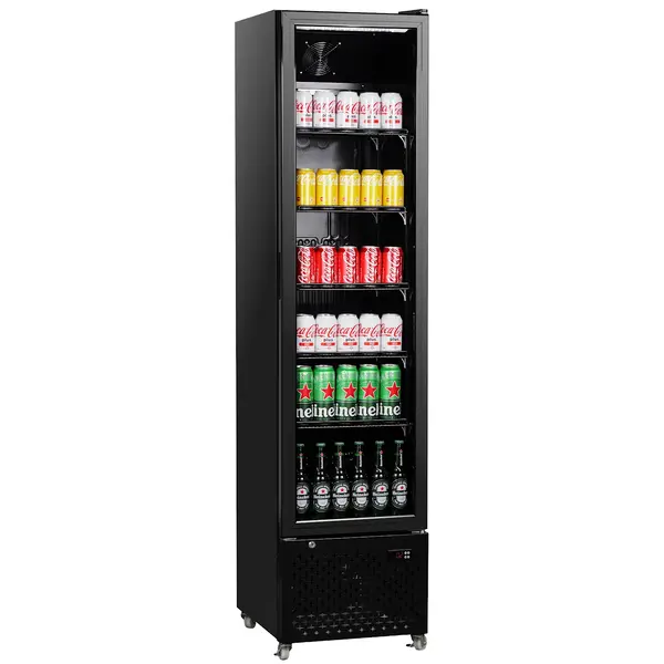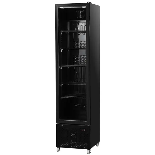 De NAP-250F vrieskast met glasdeur van CombiSteel combineert een praktische opslagcapaciteit met een compact formaat en aantrekkelijke productpresentatie. De zwarte gepoedercoate behuizing in combinatie met het aluminium interieur met zwarte afwerking zorgt voor een moderne uitstraling die perfect past in retail- en horecagevingen.