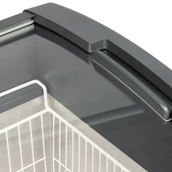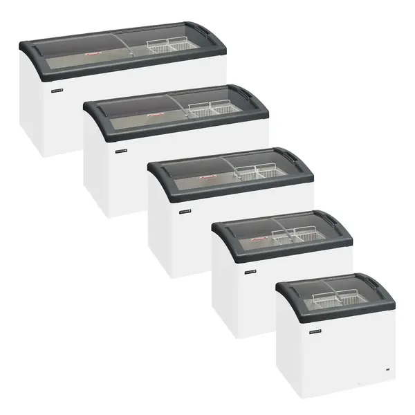 De gebogen glazen schuifdeksels zonder frame zorgen voor een moderne, open productpresentatie en optimaal zicht op de inhoud. De geïntegreerde LED-binnenverlichting met schakelaar verlicht de producten helder en gelijkmatig. Standaard worden de vrieskisten geleverd met een volledige set manden, waardoor producten overzichtelijk en aantrekkelijk gepresenteerd kunnen worden. Bovendien biedt het contrast tussen de grijze omlijsting en het witte oppervlak uitstekende mogelijkheden voor branding.
