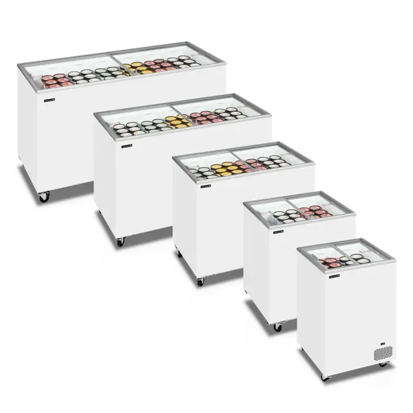 De Tefcold ICECREAM-serie biedt professionele vrieskisten met glazen schuifdeksels voor perfecte presentatie van ijs en andere diepvriesproducten.