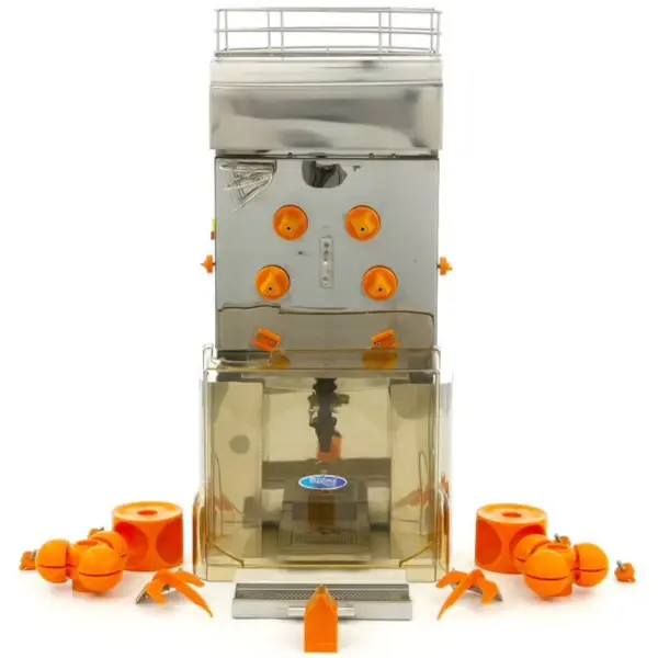 Deze Maxima vruchtenpers met automatische vulling is een luxe, professionele citruspers die ideaal is voor intensief gebruik in supermarkten, tankstations, horeca en self-service omgevingen. Dankzij de automatische aanvoer en een ruime laadcapaciteit van 20 kg perst deze machine continu 20 tot 25 sinaasappels per minuut (Ø 60–80 mm). Met de aftapkraan kunnen klanten eenvoudig zelf glazen of flessen tot 28 cm hoog vullen met vers sinaasappelsap.