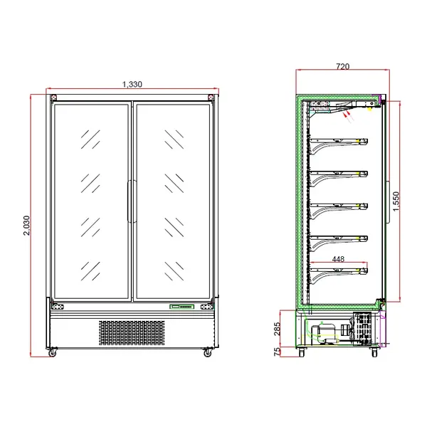 Wandkoeling | LUKE | Zwart | +2°C/+10°C | Geforceerd | Draaideuren | Wielen (Geremd) | 1330x720x2030(h)mm