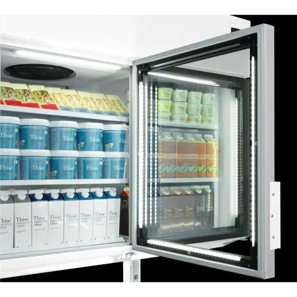Het grote glasoppervlak in de draaideuren zorgt voor samen met de interne LED-verlichting dat de inhoud goed zichtbaar is en direct in het oog springt. Door de speciale ruitverwarming wordt condensvorming bovendien voorkomen, zonder dat de interne temperatuur wordt beïnvloed.