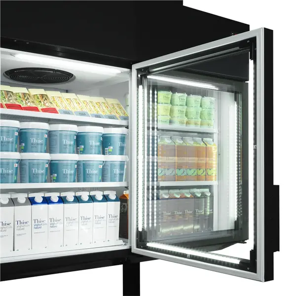Verder heeft de behuizing een strakke afwerking robuust staal met zwart of witte coating en deurframes in geborsteld aluminium met praktische en stevige handgrepen. De deuren zijn bovendien zelfsluitend, wat ideaal is bij zelfbediening en zorgt voor minder koudeverlies, waarmee energie wordt bespaard!