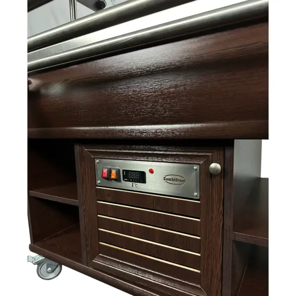 Dit professionele warmhoudbuffet van CombiSteel staat op een meubel met houten afwerking, voor een luxe en karaktervolle uitstraling, en heeft een bovenkant in geborsteld RVS met ruimte voor 1/1 GN-bakken, waarbij het buffet beschikbaar is in uitvoeringen met capaciteit voor 3x, 4x of 5x 1/1 GN.