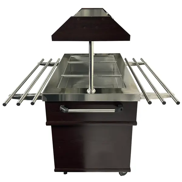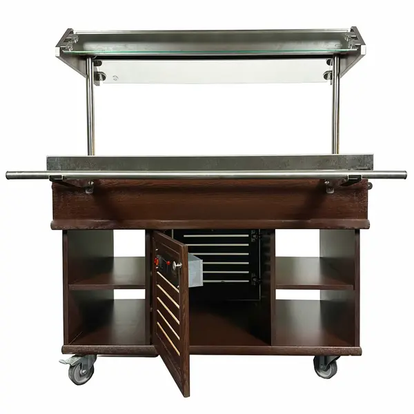 Boven de buffetruimte bevindt zich een kap op RVS staanders met LED-verlichting, voor optimale presentatie van de gerechten, en een glazen bescherming die bevuiling van de inhoud beperkt.