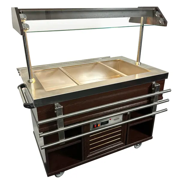Warmhoudbuffet | Hout/RVS | 3x 1/1 GN | 30°C/90°C | Bain-Marie | 3kW (230V) | Verlichte Kap | Wielen (Geremd) | 1200x700x1400(h)mm