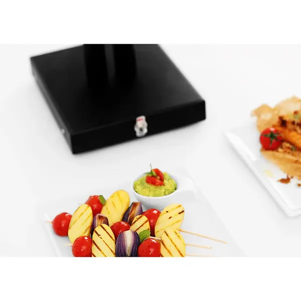 Deze Bartscher dubbele warmhoudlamp is een stijlvolle en praktische oplossing om gerechten langer op serveertemperatuur te houden. De lamp is uitgevoerd in RVS met een matzwarte coating en past daardoor perfect in moderne buffetopstellingen en open keukens. De twee armaturen zijn voorzien van een geventileerde stalen reflector die de warmte efficiënt naar beneden richt, zodat gerechten gelijkmatig warm blijven.