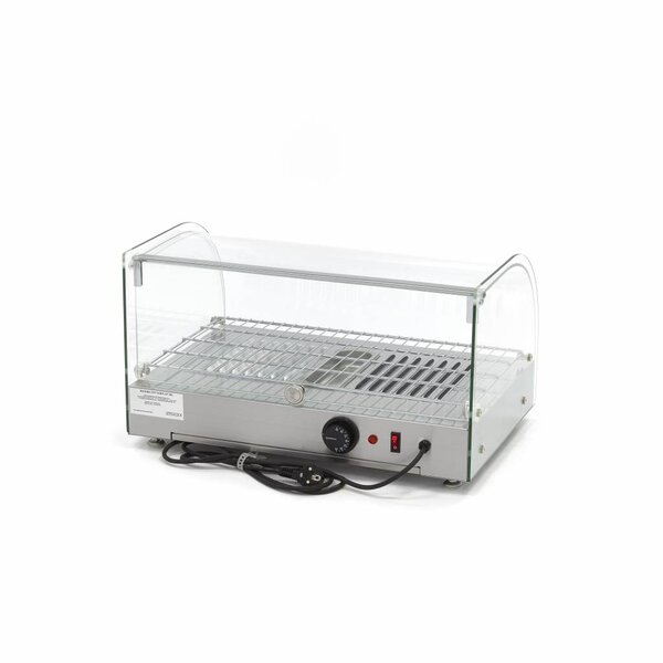 Deze stijlvolle warmhoudvitrine is een echte blikvanger op je toonbank. De gebogen glazen ruit zorgt voor een professionele uitstraling en maakt je producten goed zichtbaar. Het verchroomde rooster biedt ruimte voor kleine warme gerechten en is vast gemonteerd. De temperatuur is traploos instelbaar van dertig tot negentig graden Celsius met een eenvoudige draaiknop. De klapdeur aan de achterkant maakt het makkelijk om broodjes of snacks toe te voegen. Dankzij het compacte formaat plaats je de vitrine op bijna elke toonbank of tafel. De behuizing is gemaakt van roestvrij staal en glas, wat schoonmaken eenvoudig maakt met een vochtige doek en mild schoonmaakmiddel. Zo blijft het apparaat netjes en hygiënisch in gebruik, ideaal voor bakkerijen, lunchrooms en zelfbedieningslocaties.