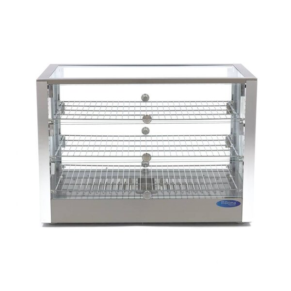 Deze ruime warmhoudvitrine van Maxima combineert functionaliteit met een professionele uitstraling. De glazen ruiten aan vier zijden en heldere LED-verlichting zorgen voor een optimale presentatie van warme snacks. De temperatuur is traploos instelbaar tussen 30 en 90°C, waardoor je de ideale warmte behoudt voor diverse producten. De vitrine is voorzien van drie vaste verchroomde roosters die ruimte bieden voor een breed assortiment aan snacks en broodjes. Dankzij het strakke RVS-ontwerp past deze warmhoudvitrine in elke professionele omgeving. De klapdeuren aan voor- en achterzijde maken het eenvoudig om producten bij te vullen of te pakken. Het onderhoud is eenvoudig door het gebruik van roestvrij staal en glas. Het waterreservoir voorkomt uitdroging van producten tijdens het warmhouden. Deze warmhoudvitrine is stijlvol, efficiënt en klaar voor intensief gebruik.
