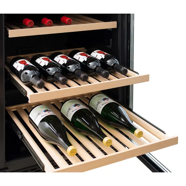 De draagroosters zijn gemaakt van speciaal hout dat niet zomeer vervormd en bestand is tegen het klimaat in de koelkast. Bovendien zijn de roosters uittrekbaar, zodat alle wijnen eenvoudig bereikbaar zijn, en naar wens in hoogte verstelbaar voor flexibele inrichting. In combinatie met de apart geschakelde LED-interieurverlichting zorgt dit voor optimale presentatie van de geëtaleerde flessen.