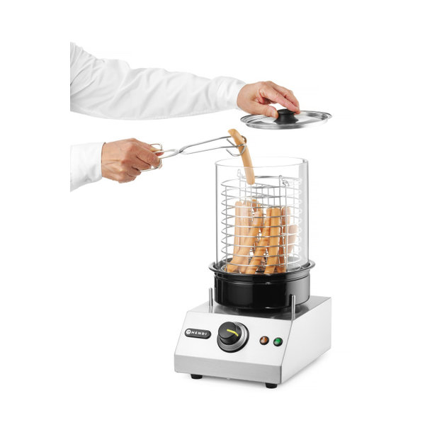 Verwarmt hotdog worstjes en houdt ze warm. Roestvast stalen behuizing, worstenhouder gemaakt van geanodiseerd aluminium en glas. Met regelbaar vermogen.
