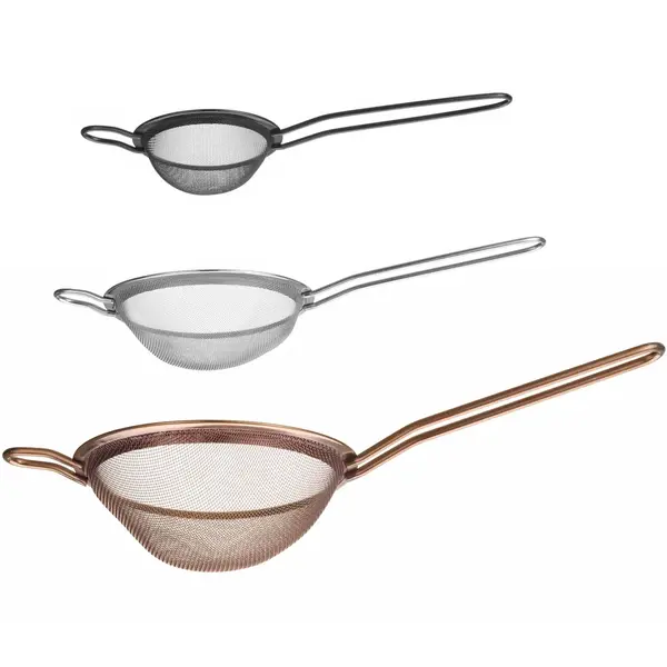 De set is uitgevoerd in drie stijlvolle kleuren: zwart, zilver en koper. De zwarte zeef heeft een diameter van 74 mm, een lengte van 215 mm en een hoogte van 25 mm, met een handgreeplengte van 115 mm en een mesh-maat van 1×1 mm. De zilveren zeef meet 105 mm in diameter, 245 mm in lengte en 30 mm in hoogte, met een handgreeplengte van 120 mm en een mesh-maat van 1×1 mm. De koperen zeef heeft een diameter van 144 mm, een lengte van 337 mm en een hoogte van 45 mm, met een handgreeplengte van 165 mm en een mesh-maat van 1,5×1,5 mm.