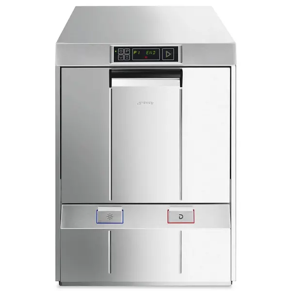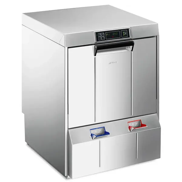 Dit dubbele reservoir voor vloeibare zeep en naglansmiddel kan aan de voorkant worden bevestigd van de SMEG glazenspoelmachines uit de series EASYLINE, TOPLINE en PURA (korfmaat 500 x 500 mm).